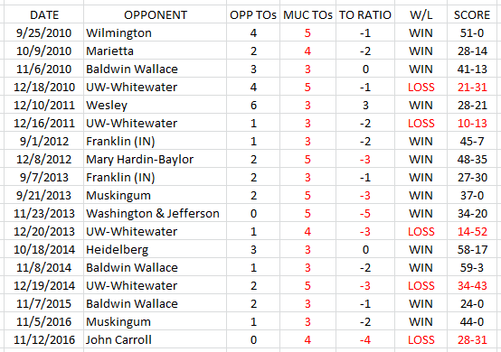 OAC Runners-Up: 2017, 2016, 2015, 2010, 2009, 2005, 2004, 2001, 2000, 1999, 1982, 1941 (Stupid Mount Union!)