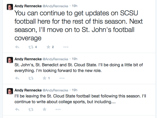 Andy Rennecke - who most recently covered SCSU for the SCTimes will be replacing Frank on the SJU beat following the football season. I've enjoyed Frank and his handling of us SJU supporters - in particular the crazy ones.