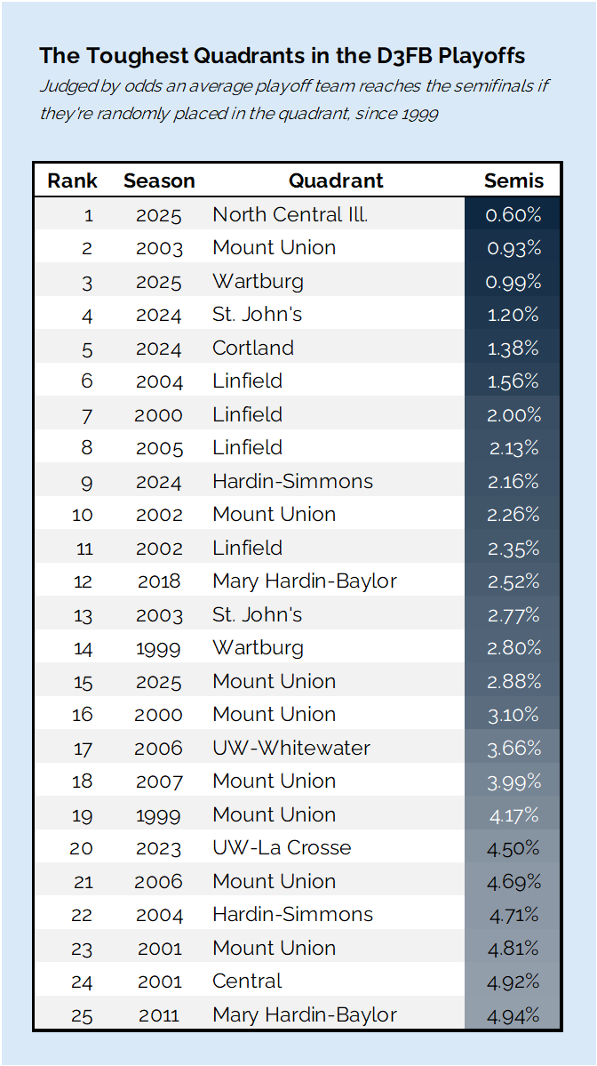 Before running these numbers I thought SJU had a tough draw. I still do, but I honestly think they're the best team in that grouping. Bethel will have to get to NCC, and then still beat the defending champs and best team in the country on the road. If anything, this says to me Bethel potentially getting NCC in the quarterfinals is a bigger diservice than Wartburg getting all the quality in their pod. They don't have to beat every team, but they aren't statistically deserving of avoiding NCC or Mount until the Stagg, save for NPI.