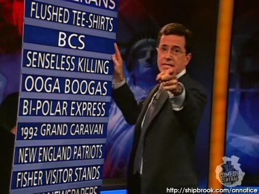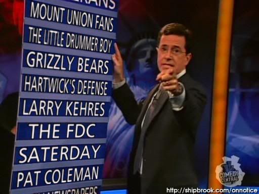 Did anyone else catch the Colbert Report last night?  He had a DIII Football On Notice board: