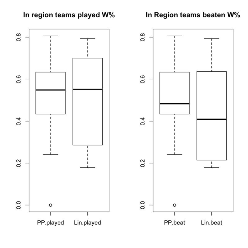 On the right, you can see what you shouldn't care. At least half of Linfield's wins are worse than the worst 25 percent of P-P's wins.  Linfield's best 25 percent of wins aren't any better than P-P's.