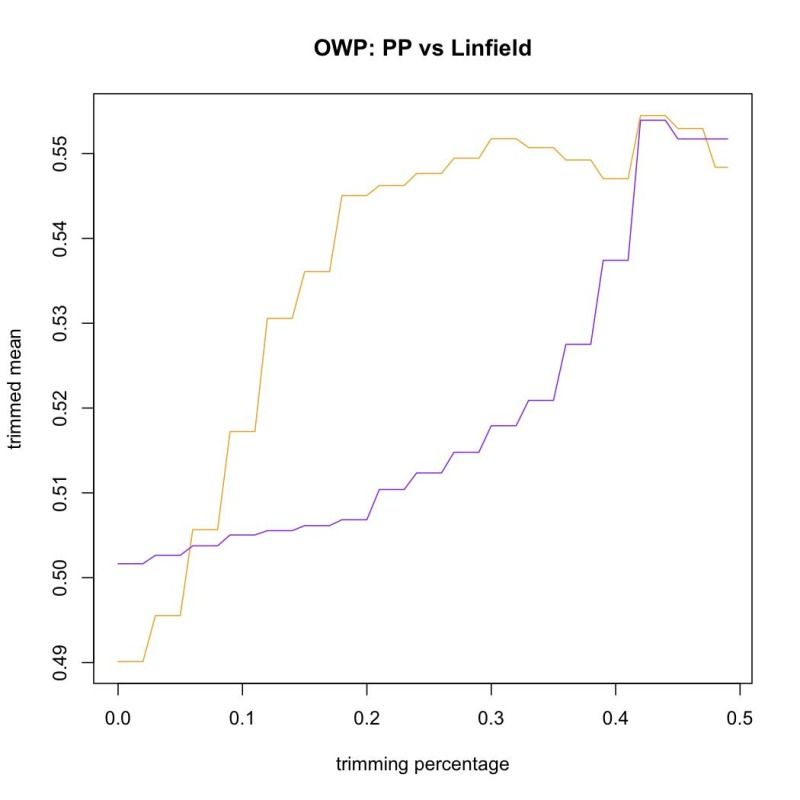 The median on the other hand is robust (this also favors Linfield, barely).  But this doesn't account for how good most of the teams you play are.  It's the mean of the middle one or two observations (depending on the whether you play an odd or even number of games).  There is an in-between, called trimmed means, which take the mean of the middle k observations, where k can vary between all of the games (the mean)  and nearly none-of-them (the median).  Let's see what happens when we compare in-region OWP for Linfield (purple) and P-P (orange) under different (but legitimate) definitions of the ill defined term "average".  (In region OWP plotted against the proportion of points removed from each side before taking the mean.)